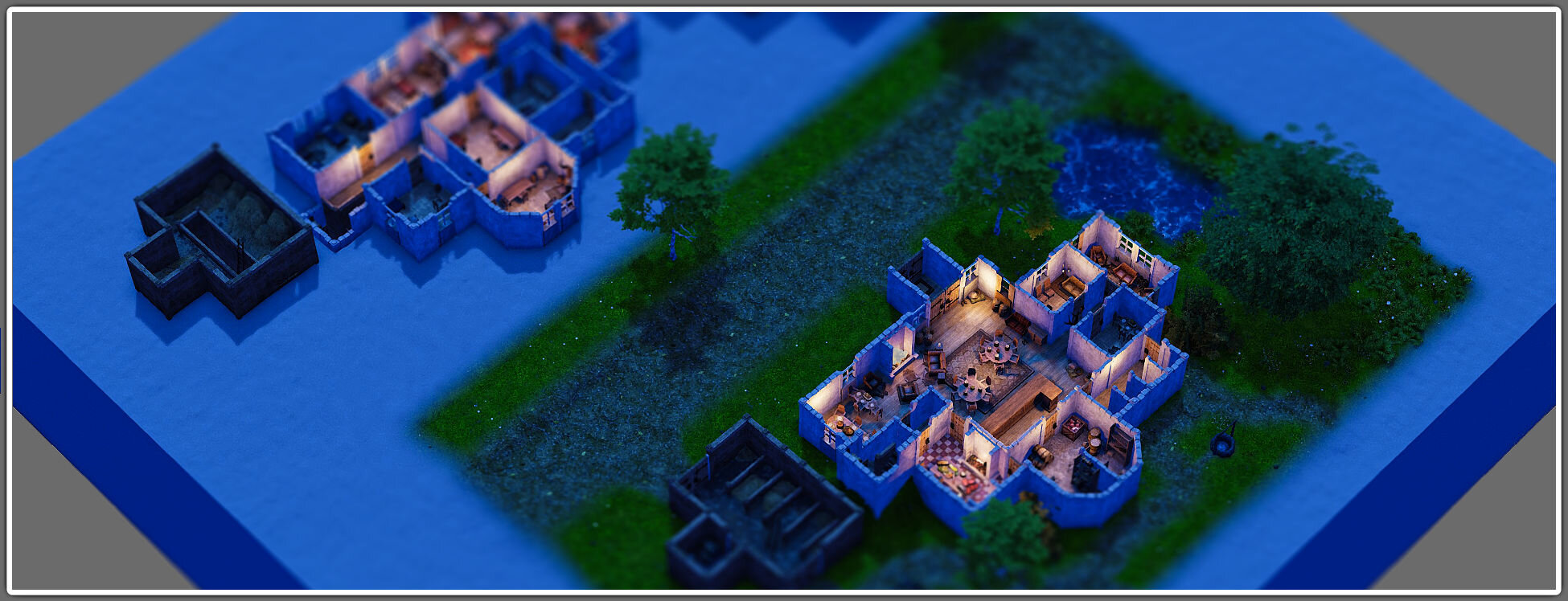 Using organic “Terrain Biomes”, automatically placed trees (Oak Tree Biome), hand placed trees (Poplar), automated room object spawning, hand placed hero objects, time of day change and room lighting.